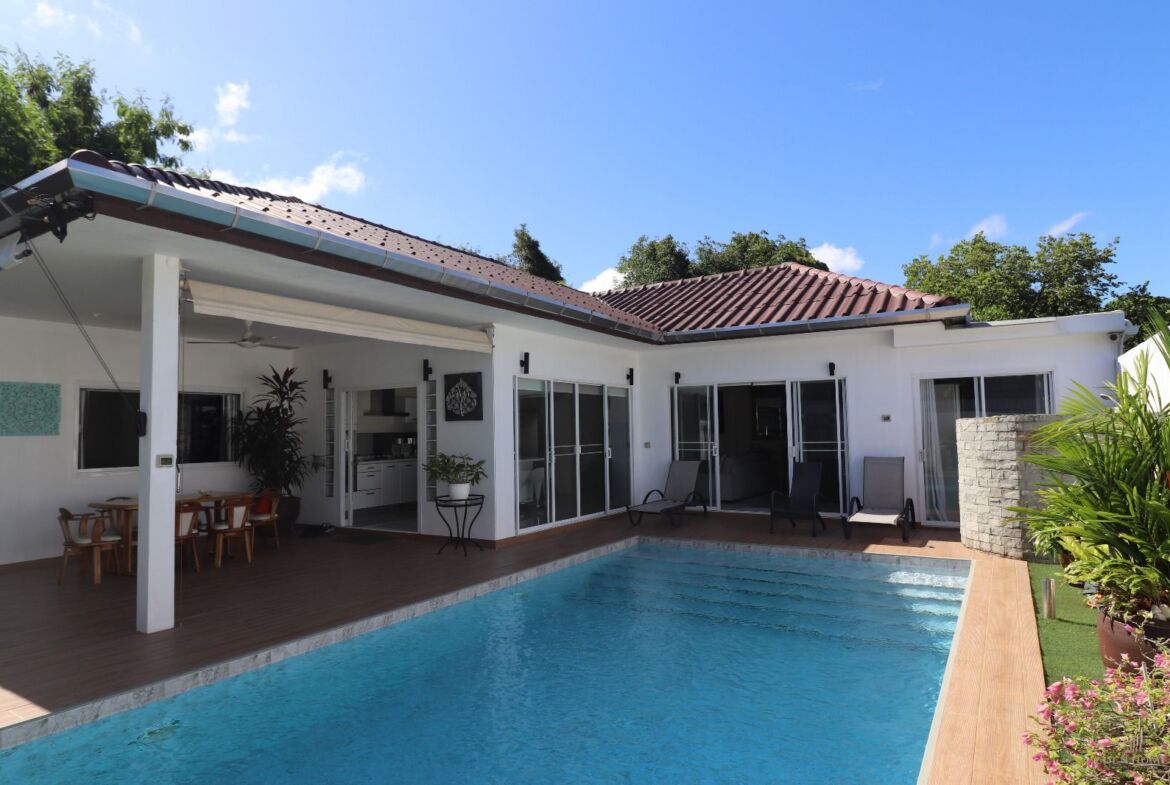 The Stunning villa offers 3 bedrooms 2 bathroom combining a modern design with nice white walls and modern interior furniture and design that gives off luxurious finish with a contemporary interior design from its walls to its furniture. The two master bedrooms features a king-size bed ensuite bathroom and the other bedroom features two twin-sized bed. The Villa comes with its own private swimming pool, a beautiful and spacious living room, and a fully equipped kitchen.