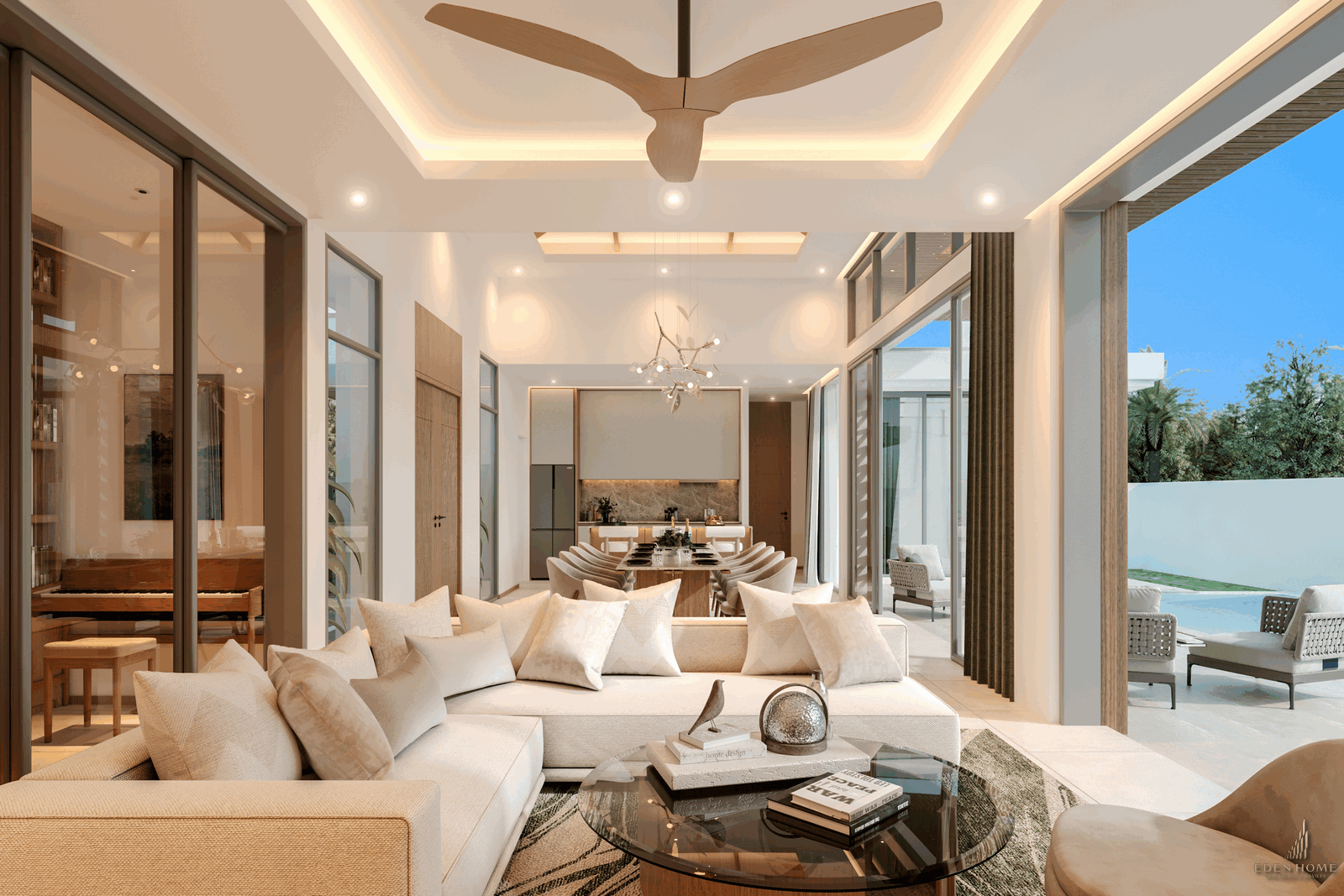 The villa itself boasts a generous build-up area situated on a spacious plot of land measuring 33,600 square meter and total area of villa is 306.60 sqm with 3-5 well-appointed bedrooms. This project presents a collection of just 36 elite pool villas. The villa offers plenty of accommodation for families or groups of friends. Each bedroom is specially designed to ensure privacy. The open-plan layout allows for easy interaction between the living room, dining area, and fully equipped kitchen. Outside the villa features a beautiful landscaped garden and a private swimming pool.
