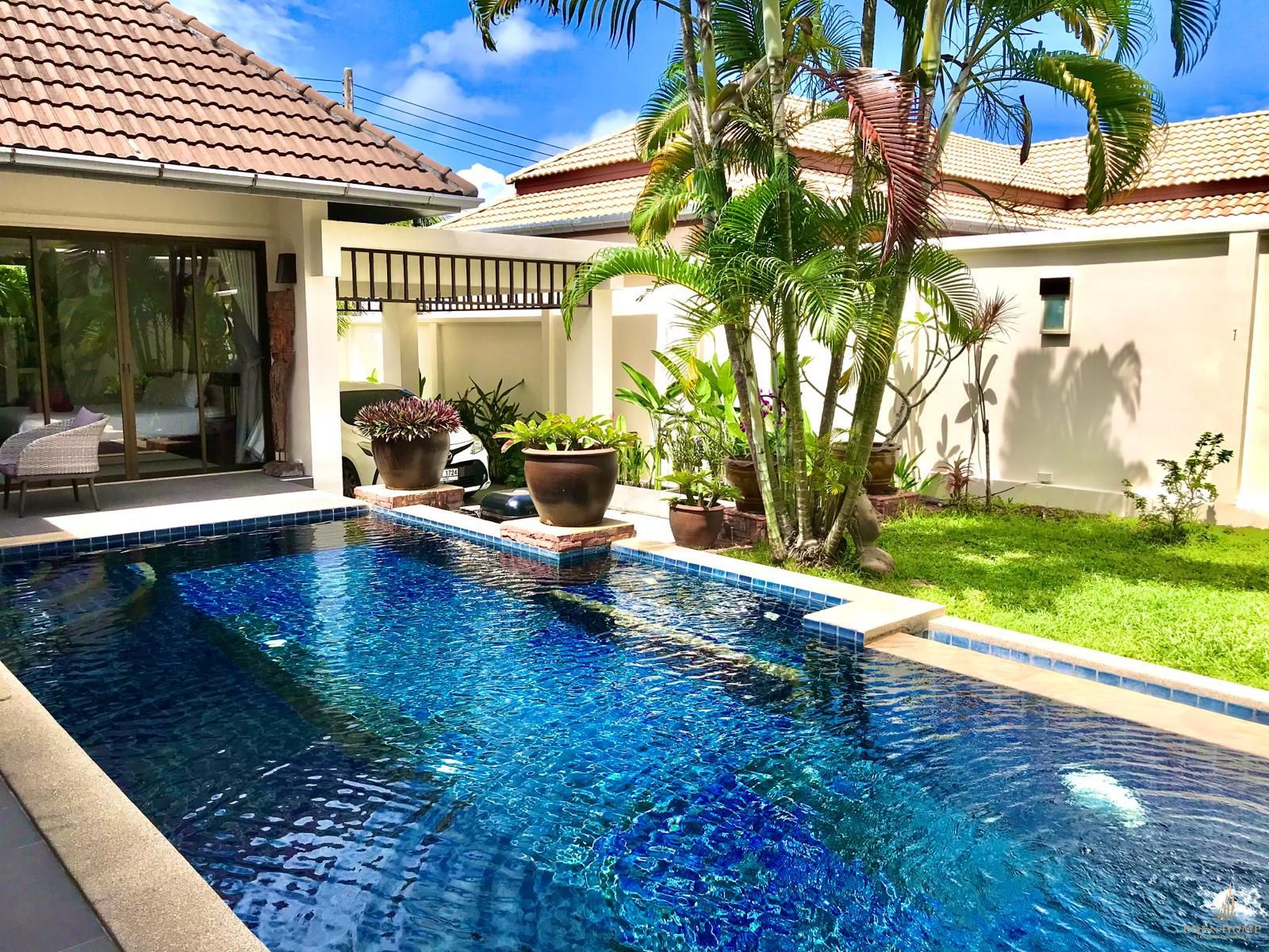 Enjoy your own space here in this spacious private pool villa with 2 bedrooms and 2 bathrooms. The villa is designed in a Thai contemporary style with charming wooden furniture; its wooden interior gives off a cozy vibe while still maintaining its contemporary feeling. The private pool villa is situated just space of the dining area, with a small garden area for extra greenery space. with a spacious common swimming pool which gives relax time in the evening. Each of the villa’s bedrooms comes with a kingsized bed ensuite bathrooms, there is even a large balcony space for residents to enjoy sunbathing in the nice Phuket weather. The Villa also comes with a living room, a nice place, a full kitchen, dining room, and private parking.